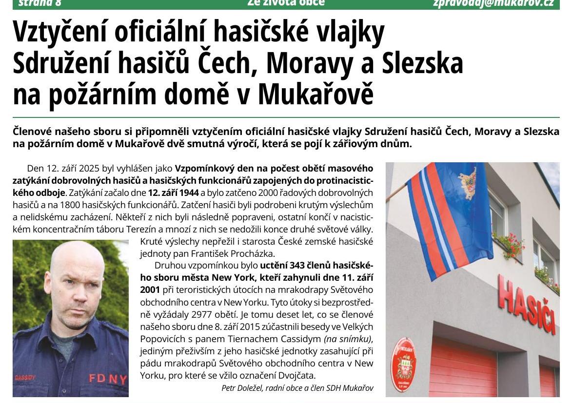 Členové sboru v Mukařově vztyčili oficiální hasičské vlajky na počest dvou smutných výročí. Dne 12. září 2025 si připomněli oběti masového zatýkání dobrovolných hasičů během druhé světové války, kdy bylo zatčeno 2000 hasičů a 1800 funkcionářů, z nichž mnozí byli popraveni nebo skončili v koncentračním táboře. Druhou vzpomínkou je uctění 343 hasičů z New Yorku, kteří zahynuli při teroristických útocích 11. září 2001.