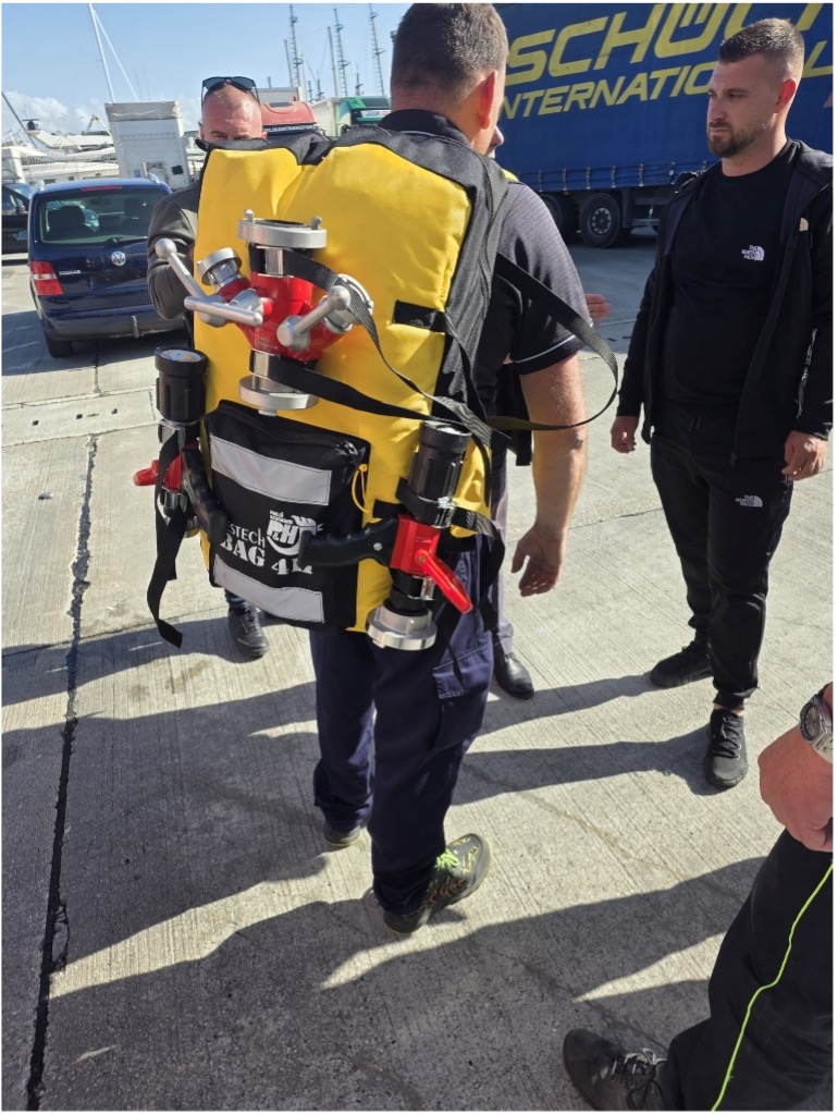Ve čtvrtek jsme vyřídili dokumenty ohledně nalodění na trajekt a odpoledne zamířili do přístavu k celnímu odbavení a naložení cisterny na trajekt. Cesta trajektem trvala asi 17 hodin. V pátek kolem 11:30 jsme přistáli v Drači v Albánii, jelikož jsme byli s cisternou až v zadní části trajektu, museli jsme počkat až se vylodí vše před námi. Na celnici na nás již čekali zástupci Albánských hasičů a města Konispol pánové Julian Lako, Adri Shino, Drilon Beqiri (velitel hasičů města Konispol) a další dva hasiči. Proběhlo předání vozidla s instruktáží obsluhy a podepsání dokumentů. N