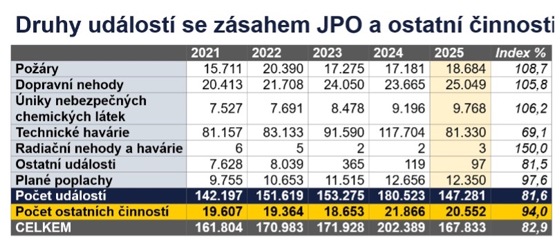 Generální ředitel Hasičského záchranného sboru České republiky genpor. Vladimír Vlček dnes na bilanční tiskové konferenci shrnul činnost Hasičského záchranného sboru ČR v roce 2025. Jednotky požární ochrany v uplynulém roce zasahovaly u celkem 167.823 mimořádných událostí, což je nejméně od roku 2021. Zároveň se ale během roku 2025 podílely na řešení hned několika neobvyklých nebo nezvykle rozsáhlých či tragických zásahů. V návaznosti na dvě mimořádné události roku 2025 hasiči podnikli celorepublikové kontrolní akce.