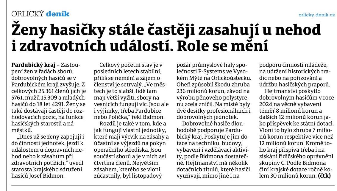 Zastoupení žen v řadách sborů dobrovolných hasičů se v Pardubickém kraji zvyšuje. Z celkových 25.361 členů jich je 5761, mužů 15.309 a mladých hasičů do 18 let 4291. Ženy se také dostávají častěji do rozhodovacích pozic, na funkce hasičských starostů a náměstků.