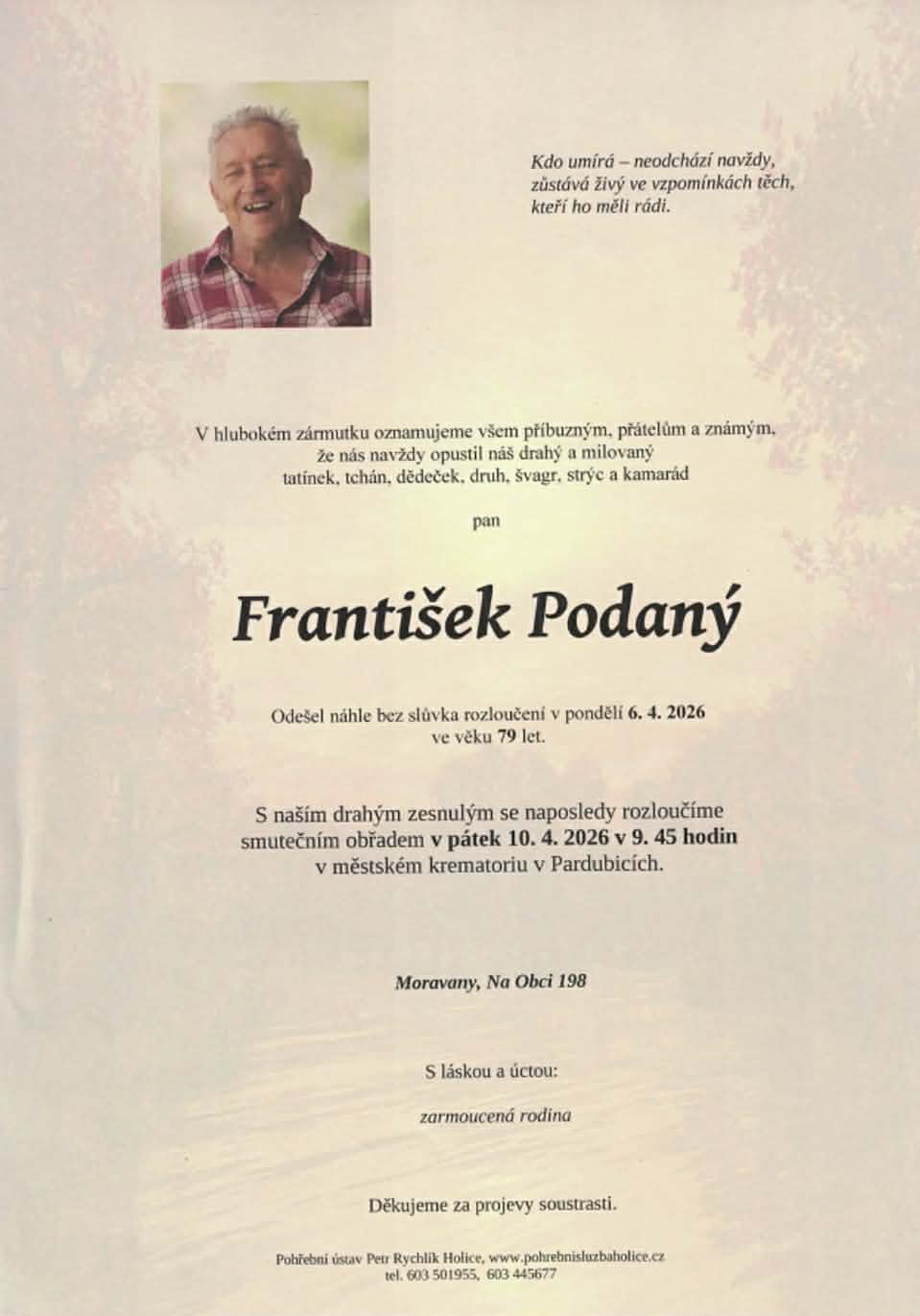 S velkou lítostí Vám oznamujeme, že v pondělí 6. dubna 2026, zemřel ve věku nedožitých 80 let FRANTIŠEK PODANÝ.