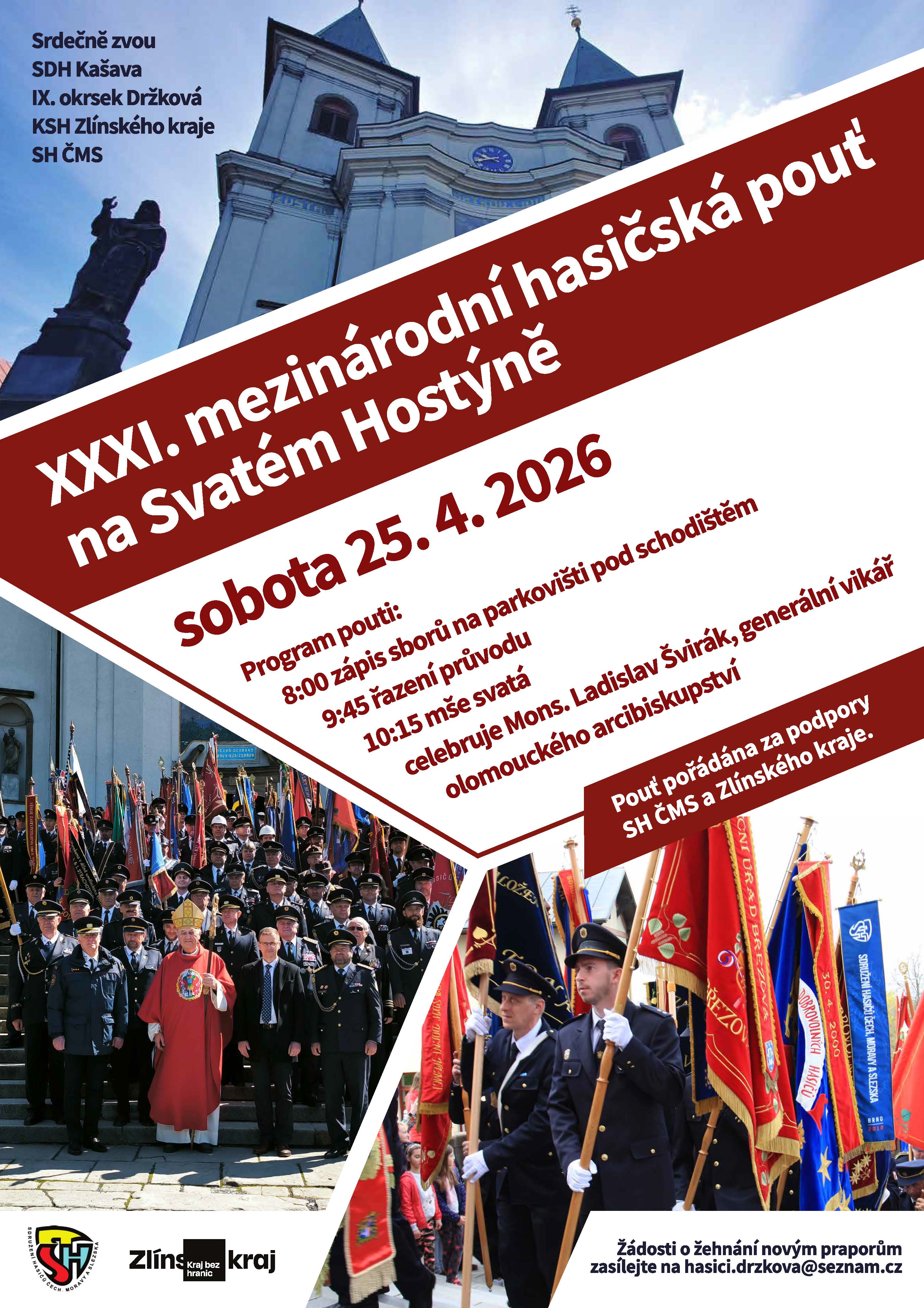 Poslední sobotu v dubnu 25. 4. 2025 nás čeká už XXXI. mezinárodní hasičská pouť na Svatém Hostýně. Zveme všechny dobrovolné hasiče a hasičky na další ročník této významné akce. Součástí programu bude slavnostní mše svatá, kterou bude sloužit Mons. Ladislav Švirák, generální vikář olomouckého arcibiskupství.